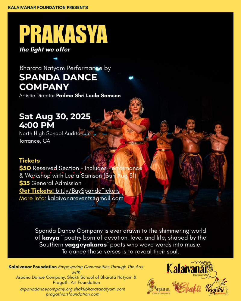 Prakasya, a radiant offering from Leela Samson’s Spanda Dance Company, opened with a performance by Shakti . The following day an inspiring workshop led by dancer and choreographer Leela Samson for students from Shakti, Arpana, and Pragathi dance companies.